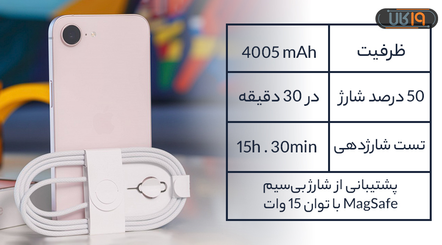 با توجه به ظرفیت 4005 میلیآمپر ساعت، باتری این گوشی در دسته باتریهای متوسط رو به خوب قرار میگیرد و برای استفاده روزمره مثل وبگردی، شبکههای اجتماعی، عکاسی و تماشای ویدیو معمولاً میتواند یک روز کامل دوام بیاورد. این دستگاه از شارژ سیمی سریع هم پشتیبانی میکند و میتواند حدود 50 درصد شارژ را در 30 دقیقه تأمین کند که برای شارژ سریع در زمانهای کوتاه کاربردی است. علاوه بر این، پشتیبانی از شارژ بیسیم MagSafe با توان 15 وات باعث میشود کاربر بتواند بدون کابل و با اتصال مغناطیسی، گوشی را بهراحتی شارژ کند.