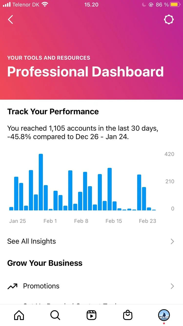 ✔️ صرفاً داشتن یک حساب کاربری بیزینس از نظر الگوریتم برتری نسبت به حساب شخصی ندارد. اما اگر استفاده از اینستاگرام واقعا برای شما جدی است، تغییر حساب کاربری به بیزینس یا تجاری هم ایده خوبی است. با یک حساب کاربری بیزینس اینستاگرام، میتوانید به اطلاعات آماری که برای حسابهای شخصی در دسترس نیستند، دسترسی پیدا کنید. به عنوان مثال، میتوانید ببینید چه زمان مخاطبان شما اغلب آنلاین هستند و چه تعداد کاربر از پروفایل شما بازدید کردهاند. برای دسترسی به اطلاعات خود با حساب کاربری Instagram، به پروفایل خود بروید و View Professional Dashboard را انتخاب کنید.