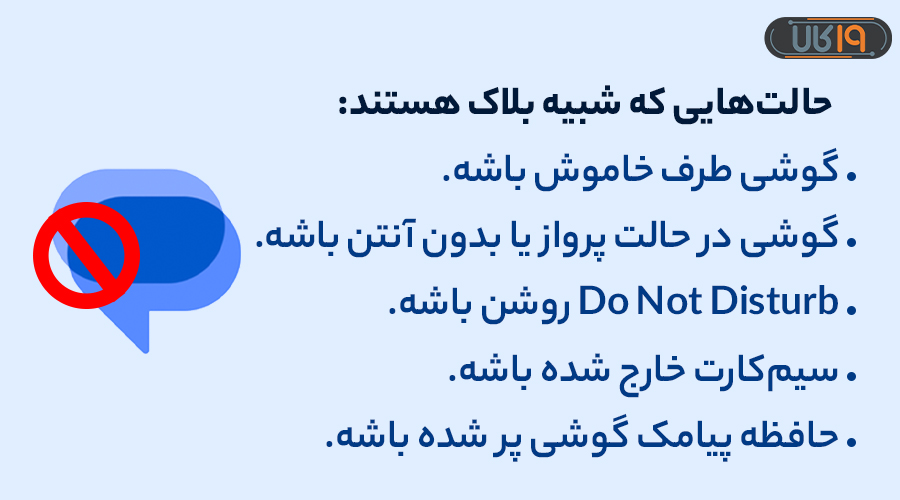 در آیفون: پیام بلاکشده، نه Delivered میشود، نه Read میخورد و نه iMessage است. معمولاً تبدیل به SMS قرمز میشود.